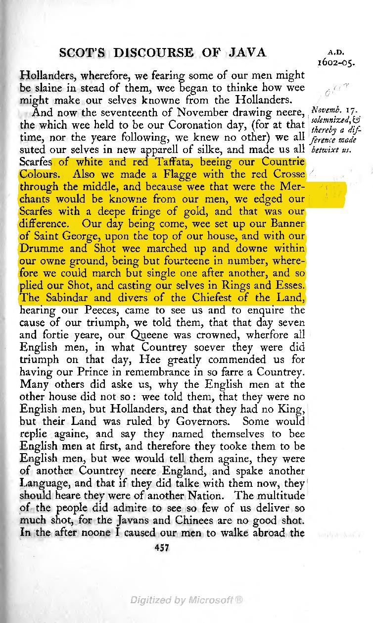 Scarfes of white and red Taffata, beeing our Countrie Colours. Also we made a Flagge with the red Crosse through the middle, and because wee that were the Merchants would be knowne from our men, we edged our Scarfes with a deepe fringe of gold, and that was our difference. Our day being come, wee set up our Banner of Saint George, upon the top of our house, and with our Drumme and Shot wee marched up and downe within our owne ground, being but fourteene in number, wherefore we could march but single one after another, and so plied our Shot, and casting our selves in Rings and Esses. The Sabindar and divers of the Chiefest of the Land, hearing our Peeces, came to see us and to enquire the cause of our triumph, we told them, that that day seven and fortie yeare, our Queene was crowned, wherfore all English men, in what Countrey soever they were did triumph on that day … [the Hollanders] had no King, but their Land was ruled by Governors.